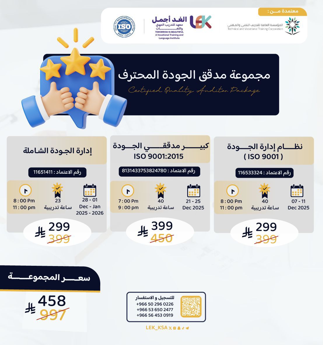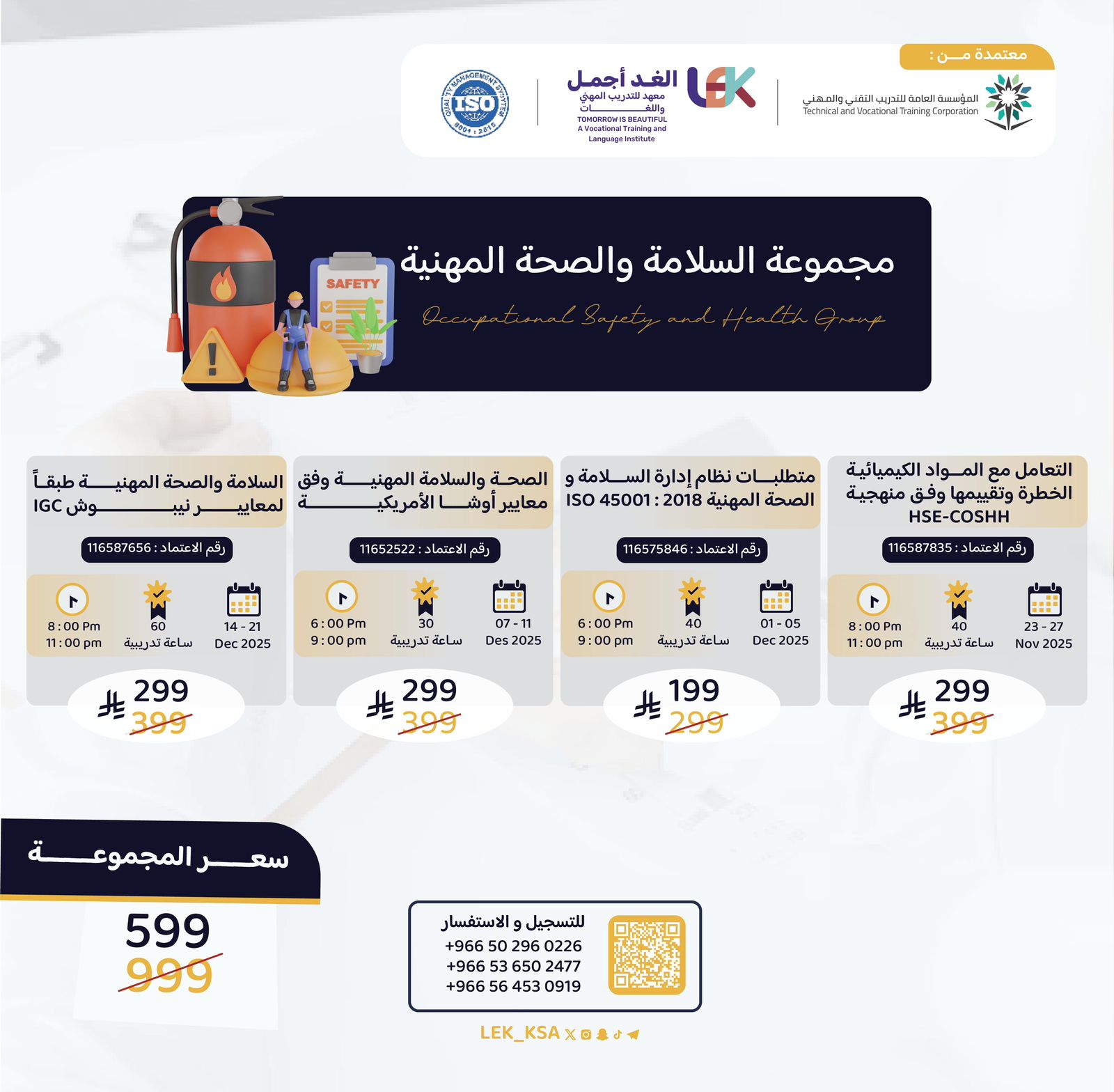 (1️⃣1️⃣التعامل مع المواد الكيميائية الخطرة وتقييمها وفق منهجية HSE - COSHH - الصحة و السلامة المهنية وفق معايير أوشا الأمريكية 1️⃣2️⃣ - 1️⃣2️⃣السلامة والصحة المهنية طبقا لمعايير نيبوش IGC - - 1️⃣2️⃣متطلبات نظام إدارة السلامة والصحة المهنية 2018 :ISO45001)